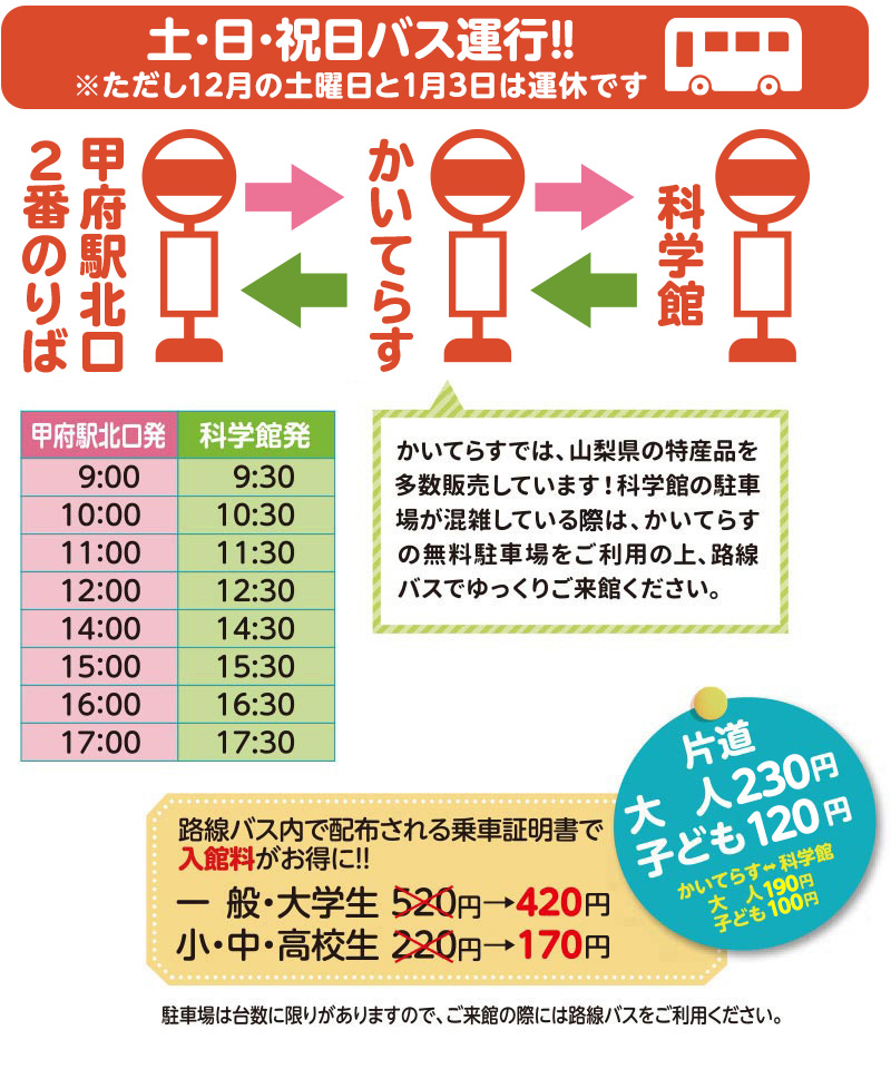 土・日・祝日・県民の日は、科学館行きの路線バスが運行されます。