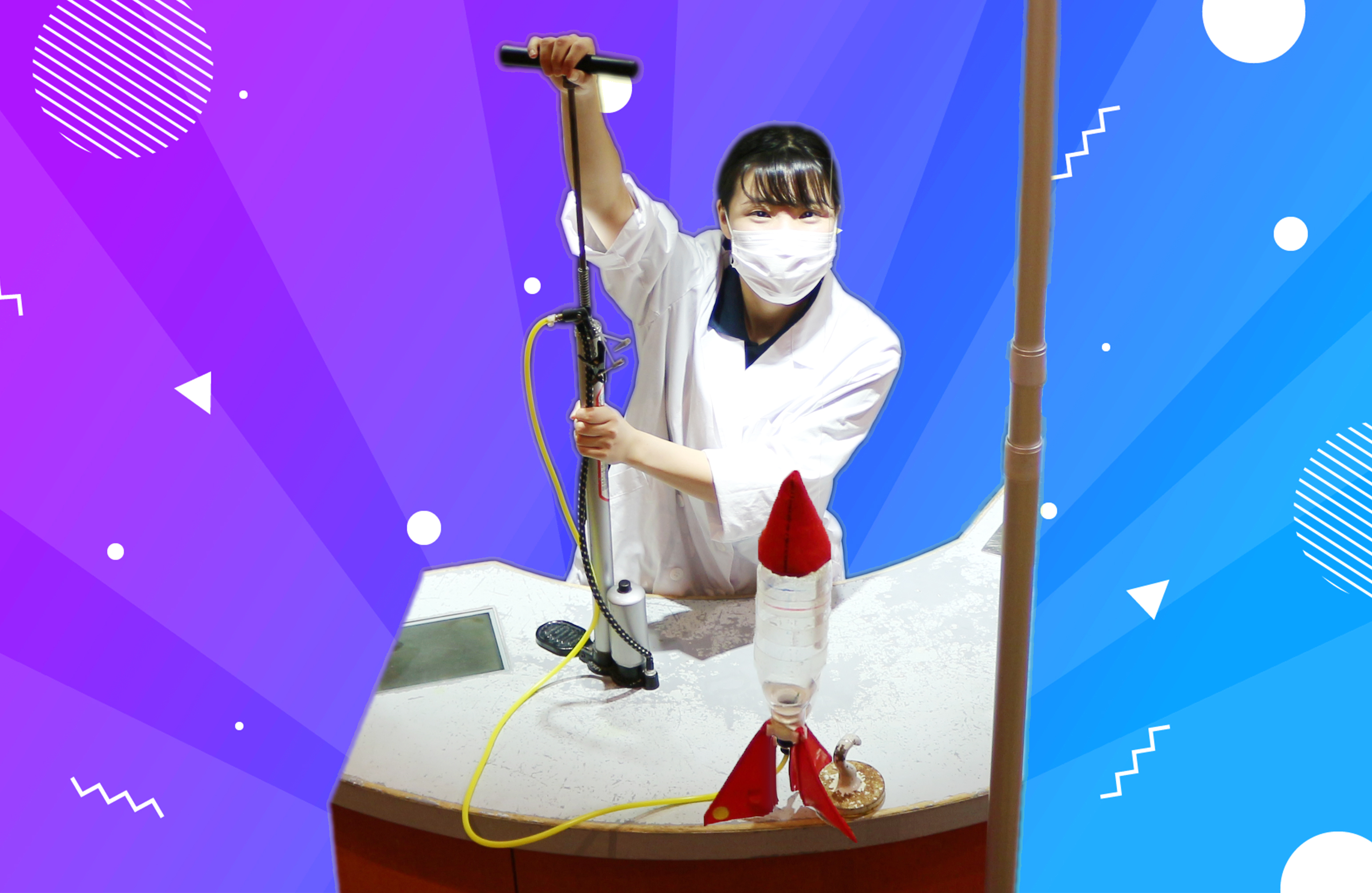 ペットボトルロケットをワイヤーに沿わせて飛ばし、ロケットが飛ぶ仕組みを紹介します。